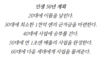 - 50대까지는 계획을 모두 달성했는데, 마지막 목표인 60대에 다음 세대에서 사업을 물려주는 것을 하지 못함.