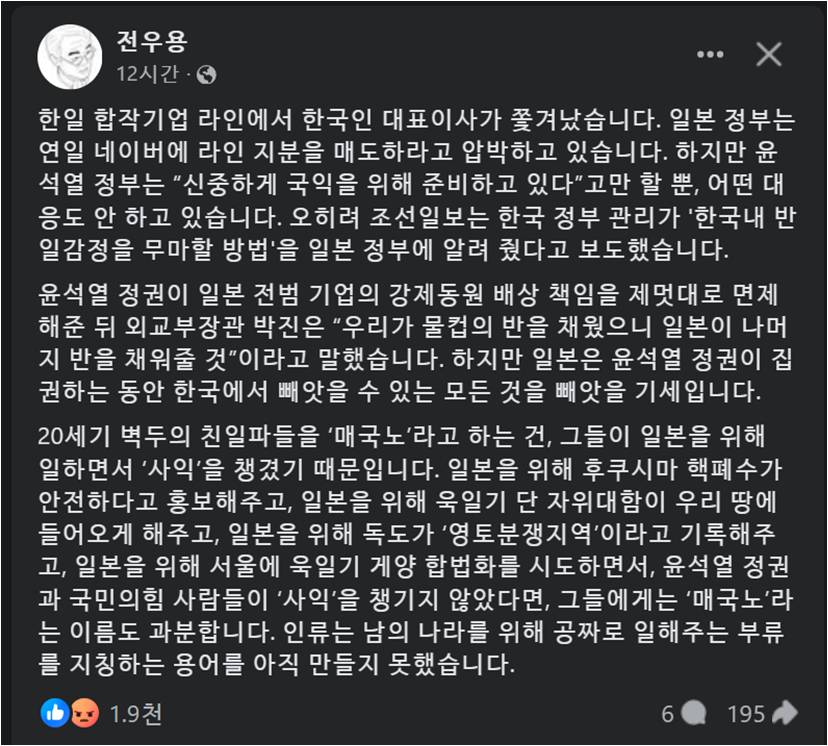 일본 정부의 네이버 지분 매각 압박은 양국 우호 관계에 찬물을 끼얹는 행위다. 일본 정부가 한국 대표 기업에 경영권 매각을 강 요하는 것은 사실상 한국이 적성국이라고 선언하는 꼴이다. 한 국민은 그렇게 받아들일 수밖에 없다. 이에 따른 부정적 파급 효 과는 심각할 수 있다. 일본 정부는 부당한 압력을 중지하고, 우 리 정부도 외교적으로 문제를 풀었으면 한다.](https://blog.kakaocdn.net/dna/t3Cct/btsHi6KWSSt/AAAAAAAAAAAAAAAAAAAAAD_SIO9-R8gzBZUQoobFU6Xe9LFLXboWjWKBnSd4bGSr/img.jpg?credential=yqXZFxpELC7KVnFOS48ylbz2pIh7yKj8&expires=1777561199&allow_ip=&allow_referer=&signature=IIF6tgjAxv48piP8SXT2Cy1%2FO%2Fw%3D)
